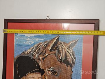 Vendo quadro con ricamo fatto a mano raffigurante un cavallo con il suo fantino Nello stato d'uso in cui si trova. Le misure sono indicate nelle foto