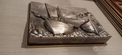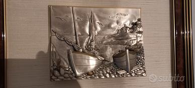 Quadro in alto rilievo in argento 800, raffigurante barche a vela, eseguito da artigiani italiani. Cornice in radica. marca Ranieri dimensioni55x49 cm cornice e 25x19 scultura in argento. Realizzato interamente a mano.