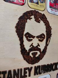 Quadro tributo al regista Stanley Kubrick. Quadro in legno con effetto 3D, la cornice, il nome e il volto pirografato a mano sono in rilievo. Incastonati ci sono intarsi in metallo che rappresentano tutte le locandine dei suoi lungometraggi. Per veri appassionati, imperdibile, pezzo unico. Dimensioni: 27x32x1cm materiale legno di pioppo e intarsi in metallo con protezione lucida in poliestere trasparente, legno trattato con olio di lino 100% naturale e atossico.
