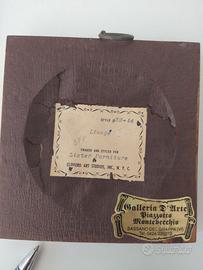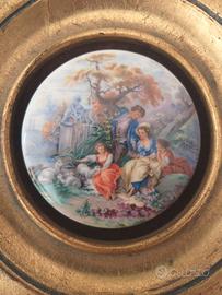 Elegante placca di Limoges, di forma circolare convessa, con scena galante di fine 1800, dipinta a mano. La placca, montata su cornice di legno patinato oro, proviene da vecchio negozio inglese, del quale rimane memoria sul retro. Misure complete: 14 x 14,5 x h.2,5 cm