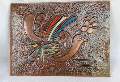 Bellissimo quadro in rame sbalzato, un pezzo d'arte cilena degli anni '60. Raffigura un uccello stilizzato con ali colorate e un fiore, con la scritta CHILE alla base. - Tecnica: sbalzo su rame. -Stile dell'artista cileno Cesar Vàsquez. - Soggetto: uccello stilizzato e fiore. - Provenienza: Cile. - Epoca: anni '60. - Misura cm. 28 X 21