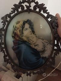 Quadro con cornice in ottone e Madonna su vetro ovale dipinto, primi del 900, con impianto elettrico per accensione piccola lampadina interna euro 100 più spedizione