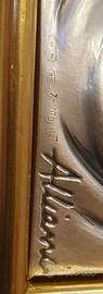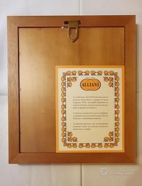 Quadro con bassorilievo raffigurante la Madonna con il Bambino, firmato dall'artista Alliani. L'opera è realizzata su una lastra in Argento 925 (argento sterling), come attestato dal punzone visibile sulla lastra e dal certificato incluso. Il quadro è ideale come capoletto, complemento d'arredo per la zona notte o come preziosa idea regalo per cerimonie (Battesimi, Comunioni o Matrimoni). Dettagli dell'oggetto: Autore: Alliani (firma incisa in basso a destra). Materiale: Lastra in Argento 925 con finiture lucide e satinate. Dimensioni totali: 23 x 26 cm (inclusa la cornice). Dimensione lastra : 9,5 x 12,5 cm. Cornice: Elegante cornice bianca con profilo dorato e passe-partout in tessuto venato. Condizioni: Pari al nuovo, mai esposto. Corredo Originale incluso: Certificato di Garanzia che ne attesta l'autenticità e la purezza dei materiali. Custodia protettiva in morbida microfibra. Scatola originale in cartone rigido. Venduto con formula AS-IS nessun reso nessun rimborso.
