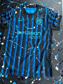 Vendo quadro fatto a mano con maglietta originale inter tela con base in legno e colori acrilici, ideale per regali di compleanno o come arredo di casa.