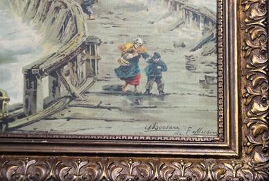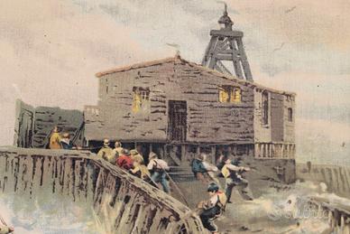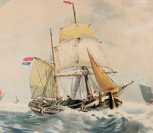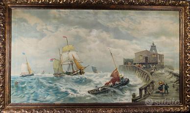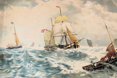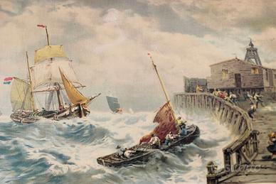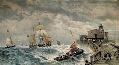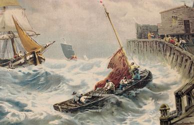 Antica stampa a colori su tela, dove si rappresenta la scena di una mareggiata in prossimità di un porticciolo.