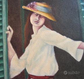 Rappresenta una ragazza con cappello nell'atto di aprire una finestra.