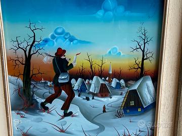Quadro naif, paesaggio rurale, dipinto su vetro a rovescio, firmato anno 1981. Misure : 35X49 cm, con cornice 56,5X52 cm.