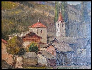 Paesaggio alpino della Valle d’Aosta, con borgo di montagna e luce autunnale calda. Opera firmata sul fronte e completa di titolo, luogo e data al retro (1983). Presente anche etichetta biografica dell’artista.
