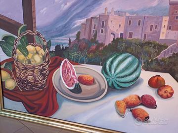 Vendo elegante quadro a olio su tela di grandi dimensioni (100x120 cm), raffigurante limoni, fichi d’India e anguria con suggestivo borgo italiano e paesaggio collinare sullo sfondo.