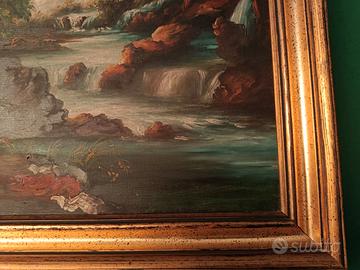 QUADRO OLIO SU TELA CON CORNICE IN LEGNO DORATA STUPENDO DIPINTO CHE RAPPRESENTA UNO STILE PAESAGGISTICO CON PARTICOLARE ATTENZIONE AI TONI CALDI DELLE ROCCE E AL MOVIMENTO D'ACQUA. COLORI BRUNI E ROSSASTRI PER LE ROCCE E BIANCHI E AZZURRI PER L'ACQUA. SCENA DI CAMPAGNA DI UN PAESAGGIO BOSCHIVO CON RUDERE, ALBERI FRONDOSI, ROCCE E UNO SPECCHIO D'ACQUA CON CASCATE CHE SCORRONO TRA ROCCE E VEGETAZIONE. TECNICA: OLIO SU TELA CORNICE: LEGNO DORATA MISURA: CM 83 X 62,5 X 6 PREZZO: 160,00
