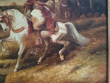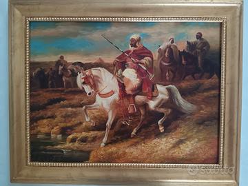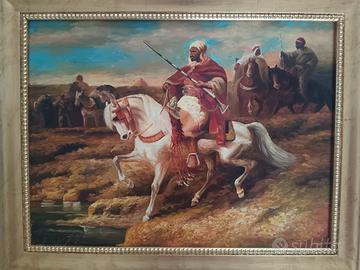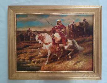 Dipinto orientalista raffigurante un cavaliere arabo su cavallo bianco, accompagnato da altre figure sullo sfondo in un paesaggio desertico. L’opera è realizzata ad olio su tavola, con una composizione dinamica e colori caldi tipici della pittura orientalista. Particolarmente ben resa la figura centrale del cavallo e del cavaliere, con dettagli decorativi negli abiti e nelle armi. Cornice in legno foglia oro nuova. Dimensioni completo di cornice 49 x 39. Dimensioni senza cornice 30 x 40.