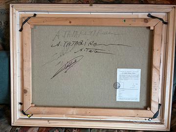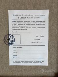 Vendo splendido dipinto originale del maestro Abdul Rahem Tatari, artista di origine siriana che ha operato a lungo a Roma, diventando un esponente riconosciuto dell’arte figurativa e naïf. L'opera rappresenta una delle scene più iconiche e ricercate dell'autore: un paesaggio invernale fiabesco con un pupazzo di neve, figure femminili in abiti tradizionali e un'atmosfera magica e sognante. Dettagli dell'opera: • Autore: Abdul Rahem Tatari • Tecnica: Olio su tela (o tecnica mista, tipica dell'autore) • Anno: 1977 (firmato e datato sul retro) • Dimensioni: [Inserisci qui le dimensioni della cornice in cm, es. 70x50 cm] • Stato di conservazione: Ottimo. Il dipinto è protetto da vetro e incorniciato in una raffinata cornice dorata d'epoca. Autenticità Garantita: Il quadro è un pezzo autentico e unico. Sul retro della tela è presente il Certificato di Autenticità e Provenienza originale firmato dall'autore, completo di numero di serie (N. 3760) e timbro a secco. Sono inoltre presenti la firma autografa e la dedica originale sul retro della tela. Note per il collezionista: Un'opera di grande calore visivo, perfetta per arredare ambienti classici o per arricchire una collezione di arte del Novecento. La presenza della documentazione originale ne garantisce il valore nel tempo.