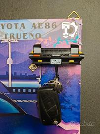 A woodend picture (20x30cm) featuring a Toyota Trueno model car that doubles as a keychain. When you hang the keys, the mechanism raises the model's headlights. The top header is made of glossy paper and the bottom is decorated with cardboard embellishments. A perfect gift idea!
