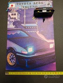 Quadro in legno (20x30cm) con modellino auto Toyota Trueno che funge da portachiavi, appendendo le chiavi il meccanismo alza i fari anteriori del modellino. In alto l'intestazione è realizzata in carta lucida nel fondo e decorata con lavorazioni in cartoncino. Perfetta idea regalo!