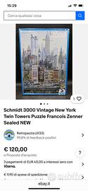 Causa cambio arredo vendo puzzle vintage della Schmidt di 3000 pezzi raffigurante New York City (Twin Towers 1986) incorniciato. Le misure del quadro sono 121 x 86, la cornice è azzurra/blu.