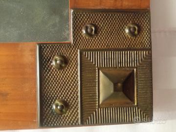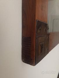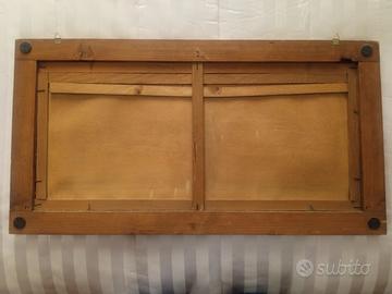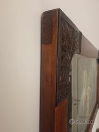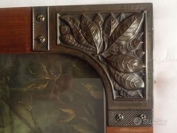 Vecchio quadro con stampa raffigurante la "Sacra Famiglia". Cornice in legno con angoli ornati in metallo lavorato + vetro di protezione. Misure 90x48 cm.