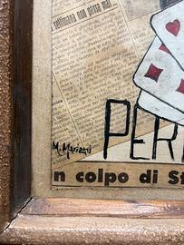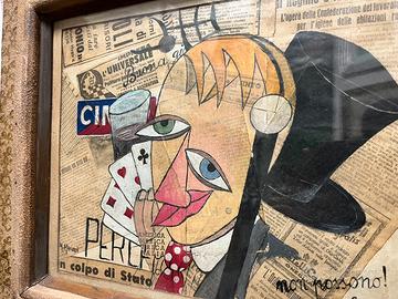 Quadro firmato M. Mariani , misura 54x47 cornice, opera 37x30 , tecnica mista anni 60-70 , veramente particolare con la sua cornice originale dell'epoca , opera unica , dipinto , pittura, collage , su giornale , con accenni al famoso Cinar , carte da gioco , cilindro e cappello , ricordano poster dell'epoca e pubblicità di illustratori importanti , stili di pittura che ricordano il famoso Wifredo Lam , Pablo Picasso , Pino Pascali , accetto proposte non sotto i 790 euro , non spedisco , consegna di persona .