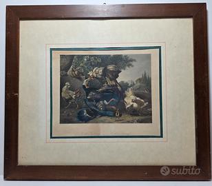 Quadro stampa raffigurante un combattimento tra galli acquarellata. La stampa è stata realizzata da Alfred Krause intorno alla seconda metà dell'800 e riproduce un dipinto realizzato da Melchior d'Hondekoeter, pittore attivo durante il XVII secolo.