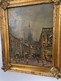 Antico quadro la vecchia Milano in tela a olio con la sua cornice a foglia d'oro intagliate autore della quadro e C .B il grande duomo e originale e del tempo Napoleone XX secolo il quadro e oricinale a un po di usura per il tempo passato a un altezza 62 X 52 di larghezza e originale antico da collezione