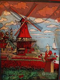 quadro in vetro cloisonnè, lavorazione a cattedrale, da appendere in trasparenza, soggetto mulino a vento. Integro