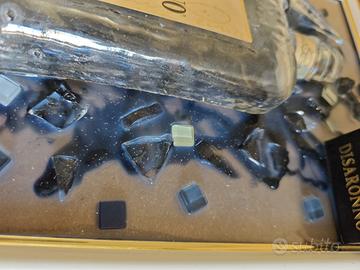 Quadro moderno con bottiglia Amaretto DI SARONNO. Misura cornice 23 x 31.5. Specchio A4. Cornice color bianco con bordi dorati. Sfondo oro con resina nera. Attenzione: il quadro è artigianale e fatto interamente a mano. Possono essere piccoli difetti di produzione. I vetri sono levigati in modo grezzo e possono tagliare. TENERE FUORI DALLA PORTATA DEI BAMBINI.