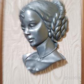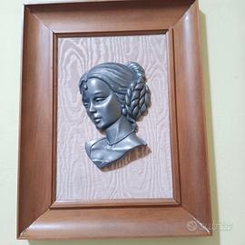 quadro vintage con volto di donna presumo di peltro massiccio ,misure altezza 43cm larghezza 33,prezzo 25euro