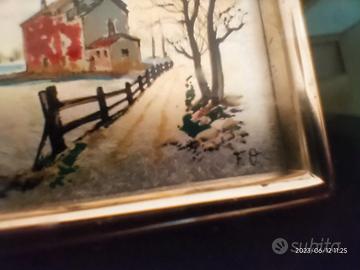 Bellissimo quadro Vintage dipinto a mano su lastra di argento 925 (timbro visibile in foto), raffigurante un paesaggio rurale. Firmato dall'autore. Con elegante cornice in legno e passepartout . Particolari e misure visibili nelle diverse foto che fanno parte integrante della descrizione. Spedizione disponibile.