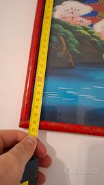 Stampa artistica d’epoca con firma e timbro orientale. Cornice originale in legno laccato rosso con vetro.