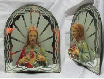 2) -- Molto bello questo quadro vintage raffigurante Cristo ma in particolare il Cuore di Gesù. Il Cristo è fissato sul vetro/specchio. Misura cm. 30 x 27