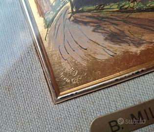 Quadro vintage su foglia d'oro di B. Milzi, XX secolo. Realizzata con la tecnica della cromolitografia su foglia d'oro. Inclusa cornice di pregio. Misure: cornice 20,5x25,6 cm; immagine interna 12x7,3 cm.
