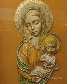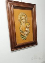 Quadro sacro vecchia icona di metà Novecento con cornice in legno di noce e scultura in gesso colorato e dorato, raffigurante la Madonna con Bambino Gesù.