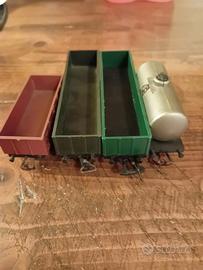 Gruppo di quattro carri merci della Jouef Francia, scala H0, cedo e spedisco. ottime condizioni, tre con ganci compatibili con I Lima, prezzo per il tutto 27 euro