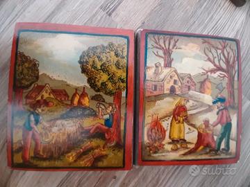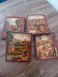 Vendo quattro piccole stampe artistiche su tavolette di legno. Sono usate e di autore ignoto. Hanno piccole imperfezioni lungo i bordi, restaurabili. Misurano 12 x 10 x un centimetro. Le scene raffigurate sono campestri: vendemmia, mietitura, preparazione della legna da ardere e pesca.