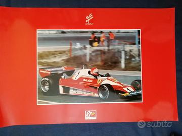 Quattro poster "Tanti auguri cavallino" stampati in occasione del 50 anniversario della fondazione della Ferrari Auto (1947/1997) - I piloti e le vetture ritratte sono: Alberto Ascari su Ferrari 375 (Indianapolis Motor Speedway 1952), Niki Lauda su Ferrari 312 T2 (1976), Gilles Villeneuve su Ferrari 126 C (1981) e Michael Schumacher su l podio del G.P. di Spagna 1996 (prima vittoria in Ferrari) - Dimensioni cm. 64 x 42 - Il prezzo è da intendersi complessivo dei quattro poster