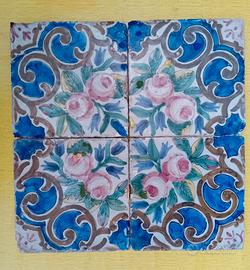 Quattro mattonelle in maiolica policroma cm. 20x20, decoro a cellula quadripartita, con ornato floreale. Marca incussa nella pasta sul retro da cui si evince Vincenzo Maiurino databili ca. metà Ottocento. Diversi difetti sia di cottura e sia del tempo, maldestri ritocchi su parti stuccate.