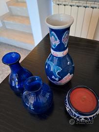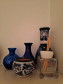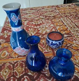 Quattro vasetti blu, due in vetro, uno in ceramica porta candela, uno in ceramica porta fiori. Nuovi. In omaggio piccolo diffusore, in vetro, per ambiente (vedi ultima foto).