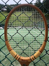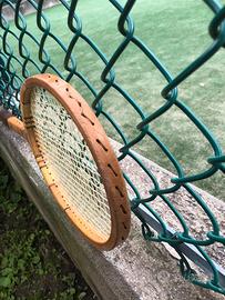 Racchetta in legno anni 70, vintage, per appassionati e collezionisti. Ideale anche come complemento d’arredo da parete. Incordatura e nastro impugnatura originali. Piatto corde cm 23. Lunghezza tot cm 68,5. Manico 4. In omaggio custodia d’epoca in stoffa (danneggiata).
