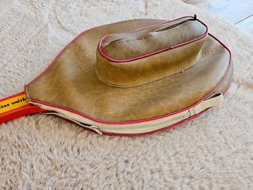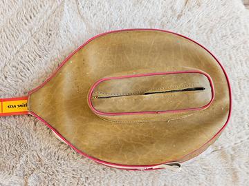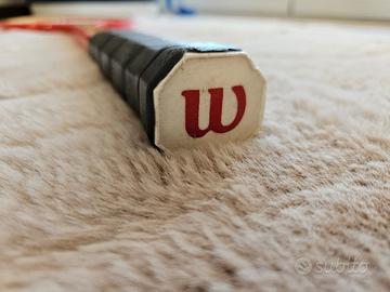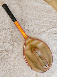 Racchetta da tennis vintage Wilson modello Stan Smith Champ, modello in legno popolare negli anni '70. Materiale: Legno con telaio verniciato di rosso. Dettagli: Presenta il nome del modello "STAN SMITH CHAMP" stampato in giallo e il marchio "Wilson®" in bianco sul telaio. Stato: Oggetto da collezione, tipico di un'epoca passata del tennis.