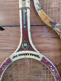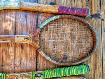 racchette da tennis in legno anni 60 un po logorate cone visibile in foto. una racchetta è curva. non vendo separatamente.