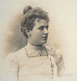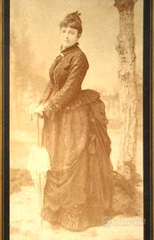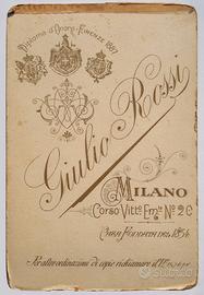 Sono 35 immagini realizzate da fotografi professionisti italiani tra la fine dell'Ottocento e il principio del Novecento. Tutte le foto sono montate su cartone rigido e 25 di esse recano stampigliature o timbri a secco che identificano lo studio fotografico di provenienza. Sette esemplari hanno anche veline protettive fissate ai cartoni di montaggio. La raccolta comprende immagini col marchio degli studi milanesi di Rinaldi & Pacchioni (1 esemplare), di Guigoni & Bossi (7 esempl.), di Varischi & Artico (1), di Carlo Marcozzi (1), di Anacleto Bini(1), di Carlo De Marchi(1), di Achille Ferrario (1) e di Leone Ricci (2). Ci sono inoltre foto di Pietro Tempestini, attivo a La Spezia e a Viareggio (1 esemplare), Achille Malliani di Lodi (1 es.) e Raffaello Donnini di Pisa (2). Nella galleria di ritratti fotografici splende una figura femminile di Luigi Fiorentini, che aveva il proprio studio a Padova ma lavorava a Recoaro durante la stagione balneare. Una bimba a dorso d'asino sorride da una foto di Gustavo Alfredo Bressanini, attivo a Verona e a Recoaro. Uno scatto del cremonese Ettore Bertani è accompagnato dalla didascalia "Piero a sei mesi", manoscritta sul cartone di supporto. Si segnalano, infine, un'immagine di Luigi Montabone e due di Giulio Rossi. Il primo è noto per i suoi ritratti di Giuseppe Garibaldi, Amedeo I d'Aosta, Umberto I, Vittorio Emanuele III e Margherita di Savoia. Nello studio di Rossi andarono a posare, fra gli altri, Cesare Cantù e Alessandro Manzoni. Pur presentando i segni del tempo (fioriture, ingiallimenti) tutte le fotografie sono integre, come anche le loro montature di cartone. Il prezzo si intende riferito all'insieme delle 35 fotografie, che non sono vendibili singolarmente.