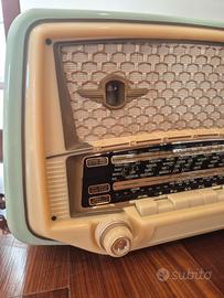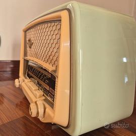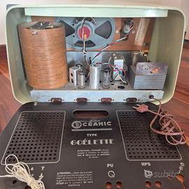 Da collezione, prodotta a Parigi nel 1958. Unica, totalmente revisionata. Perfetta, con un mobile di colore verde pastello. Bellissima da esporre. Monta 5 valvole - Occhio magico di un bel verde vivo. Quattro gamme onde, presa phono funzionante. Si sente benissimo. Suono valvolare caldo e potente. Misura cm 45 x 28,5 x 18,5. Sorella maggiore della più piccola Oceanic Pirate.