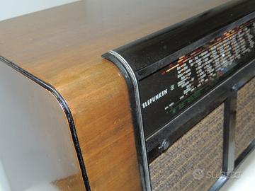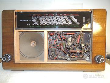 Marca TELEFUNKEN modello ZEESEN T875WK Prodotto nel 1938/1939 in Germania monta 5 valvole ACH1 AF3 ABC1 AL4 AZ1 3 gamme d'onda OM, OC e OL. Altoparlante elettrodinamico con bobina di eccitazione di campo, il mobile è in condizioni perfette non ci sono ammaccature restaurate, solo lucidato, la tela frontale è originale come lo chassis è originale e funzionante, dimensioni 568x349x310 mm peso 12,6 Kg. Schema elettrico a corredo, dati su radiomuseum.