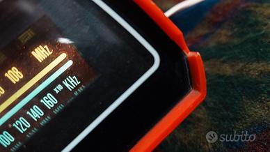 Orologio digitale con una radio AM/FM., funzionalità classiche come l'impostazione dell'allarme e una funzione "sleep" per lo spegnimento automatico della radio.Case Arancione con lieve rottura laterale dx, condizioni buone, bellissimo oggetto di modernariato tipo degli anni fra il '70 e gli '80. Da revisionare.