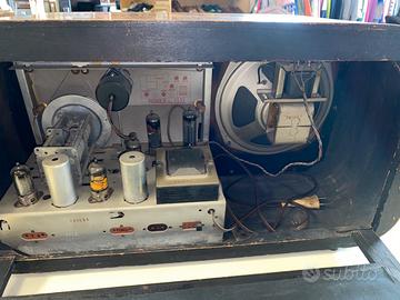 Radio a valvole Phonola modello "5533". Italia, 1951-1952. Cassa in legno impiallacciata e bordata in radica. Ghiera e pomoli in bachelite. (cm 57x29x23) perfettamente funzionante