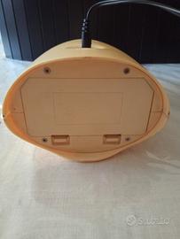 Radio portatile " Gildo " dei fratelli Guzzini. Pezzo vintage di design anni '80/'90 progettata da Dario Tanfoglio - in plastica di colore giallo - stile " space Age ' - modernariato - da collezione . Funzionante sia con pile che con alimentatore ( ATTENZIONE l'alimentatore non è quello originale ). SEGNALO una differenza di colore ( dovuta ad esposizione al sole ) tra la parte avanti e la parte dietro del solo lato sinistro ( segnalata in foto).