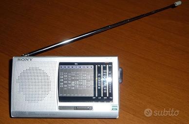 Radio portatile Sony ICF-SW11 con 12 gamme d'onda (FM, OM, OL ed OC suddivisa in 9 bande). L'FM, utilizzando le cuffie, è ricevuta in STEREOFONIA con ottima qualità audio. Indicatore di sintonia. Richiede 2 pile stilo (non fornite) con possibilità di alimentazione esterna a 3 V. Funzionamento impeccabile con buona sensibilità. Vano pile ed antenna perfetti. Supporto posteriore per posizione inclinata. Solo piccolissimi segni del tempo sulla base inferiore. Manca la maniglietta per il trasporto deterioratasi nel tempo.