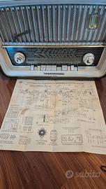 Radio a valvole totalmente revisionata, si sente benissimo, ma anche bella da esporre. Monta 6 valvole, occhio magico nuovo. Suono valvolare molto caldo e potente in FM. Tre altoparlanti originali in perfette condizioni. Elegante e riconoscibile dalla bordatura a filo dorato originale nella parte frontale che le dona un grande tocco di eleganza ed unicità. Peso 8,2 Kg, misura cm. 46 x 30 x 20.