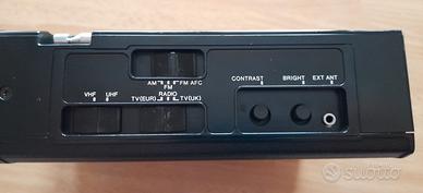 Radio televisione JVC P-100EUC portatile vintage degli anni 70 con radio AM/FM e micro televisione VHF alimentazione a batterie (non incluse) o alimentatore esterno, antenna telescopica superiore. La radio AM/FM funziona mentre la TV analogica VHF si accende ma non più utilizzabile senza appositi convertitori. Ha normali segni del tempo e nello sportellino delle batterie si è levata un po' di vernice. Con custodia in pelle originale, visore frontale per TV, alimentatore e valigetta plastica per trasporto ma non ho libretto d'istruzione.