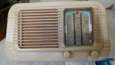 Radio vintage originale anni 50 funzionante. In bachelite color avorio, manopole originali, scala parlante con città europee. Dimensioni 30x12, altezza 16. Condizioni estetiche buone, con normali segni del tempo che ne testimoniano l'autenticità.