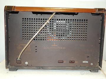 Marca SIEMENS modello QUALITATSSUPER 53 Tipo SH823W prodotto in Germania dal 1952 al 1953 monta 7 valvole EC92 EF80 ECH81 EF41 EM4 EABC80 EL41 , 4 gamme d'onda FM OM OC e OL, chassis completo, revisionato ora funziona perfettamente. La vernice del mobile è screpolata, questa è una caratteristica di questo modello, anche i tedeschi alle volte sbagliano qualcosa, comunque è restaurato e lucidato. Dimensioni (LxAxP) 524x350x230 mm peso 10 Kg. Schema elettrico a corredo, servizio completo disponibile in rete da radiomuseum